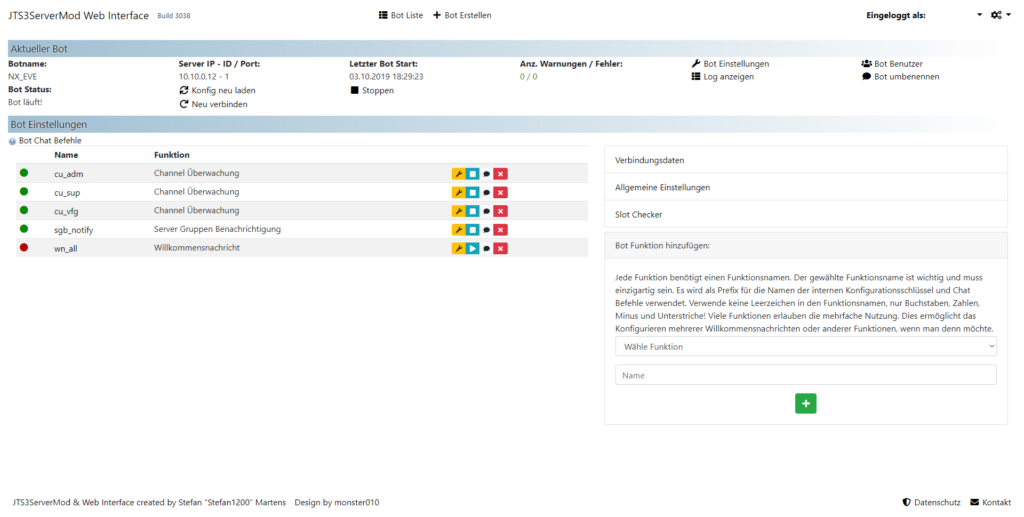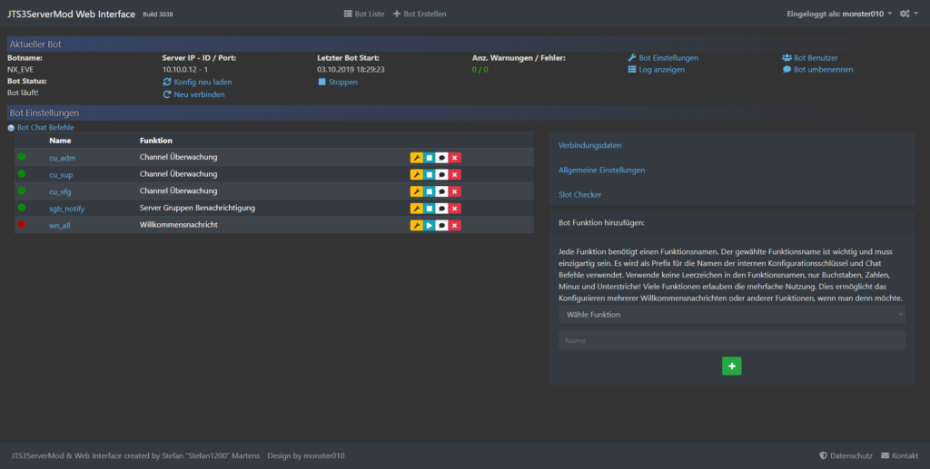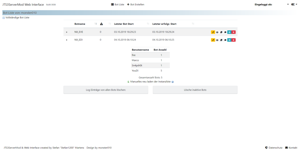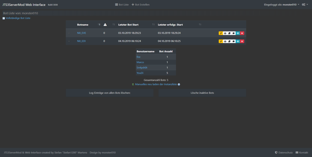 Zur leichteren Suchen nach einem bestimmten Bot oder User, ist ein Suche Feld auf den Seiten eingebaut. Damit man auf dem aktuellsten Stand bleibt, was das Interface angeht, ist eine Versionsprüfung eingebaut. Diese informiert bei einer neuen Version den Admin per Pop-Up.